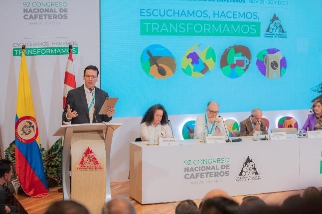 Bogotá, 3 de diciembre de 2023 (Prensa FNC) – En un ambiente de unión y armonía entre el gremio cafetero y el Gobierno Nacional, concluyó el 92 Congreso Cafetero. ´Escuchamos, hacemos, transformamos’, fue el lema que utilizó el gerente general de Federación Nacional de Cafeteros (FNC), Germán Bahamón Jaramillo, durante el evento realizado en la sede de la FNC en Bogotá, en donde se vivió la democracia cafetera en pleno, trazando la ruta de transformación para el año 2024, que beneficiará a las más de 548 mil familias cafeteras colombianas.
