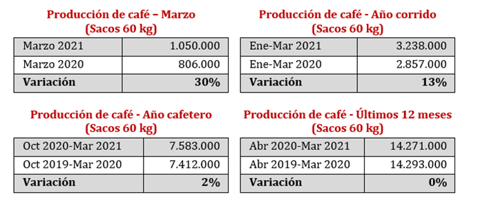 En lo que va del año cafetero (octubre 2020-marzo 2021), la producción fue de casi 7,6 millones de sacos, 2% más frente a los 7,4 millones producidos un año antes. Y en los últimos 12 meses (abril 2020-marzo 2021), la producción llegó a 14,3 millones de sacos, igualando la producción del mismo periodo anterior.