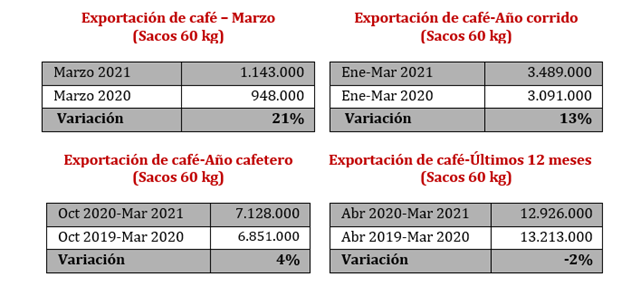 Las exportaciones de café colombiano en marzo superaron 1,1 millones de sacos de 60 kg, 21% más frente a los 948 mil sacos exportados en marzo de 2020.